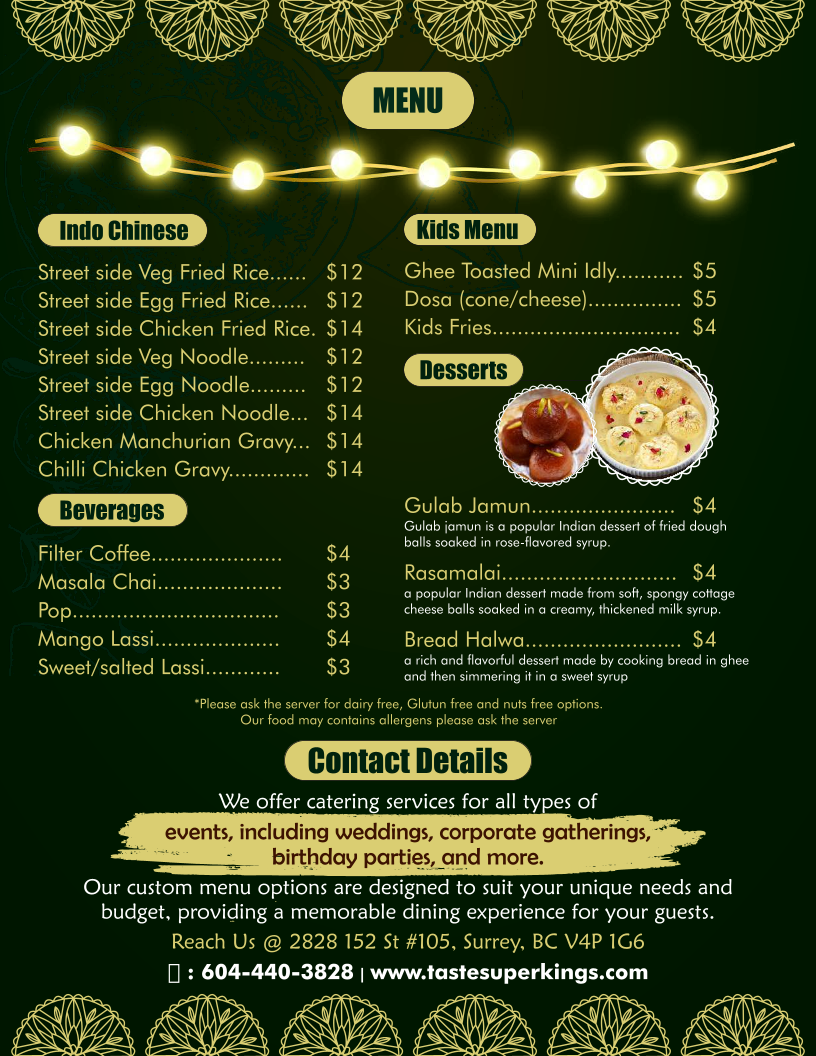 Introducing the Menu at Taste of Super Kings invites you to embark on a vibrant culinary journey. Located in Surrey, BC, this restaurant specializes in authentic South Indian and Indian street food. The menu is a delightful blend of flavors, featuring tantalizing chaats such as the crispy Golgappa and the savory Pav Bhaji—a true homage to Bombay street food.